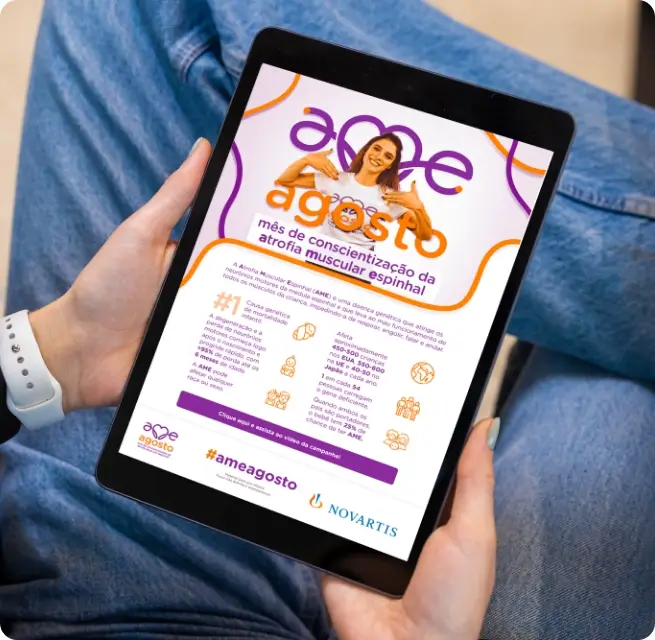 O desafio foi criar uma campanha para conscientização da AME – Atrofia Muscular Espinhal, doença rara que atinge 1 em cada 10 mil recém-nascidos. Como solução, criamos uma ação direcionada às mães, que, em geral, estão mais próximas do bebê nos primeiros meses e terão mais capacidade para identificar os sintomas da doença. A campanha contou com a participação da atriz Rafa Brites e a parceria com ONGs.